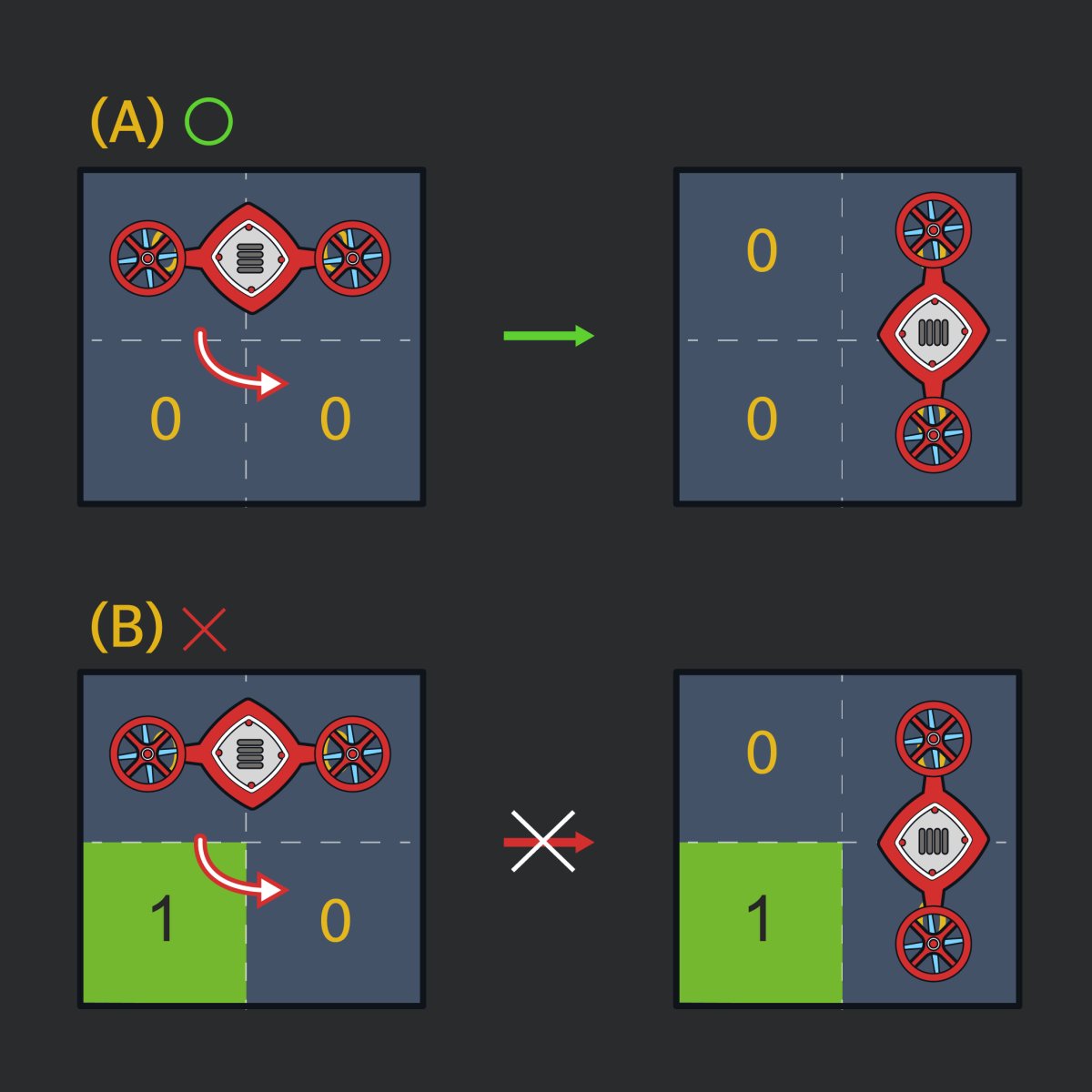 로봇이 움직일 때는 현재 놓여있는 상태를 유지하면서 이동합니다. 예를 들어, 위 그림에서 오른쪽으로 한 칸 이동한다면 (1, 2), (1, 3) 두 칸을 차지하게 되며, 아래로 이동한다면 (2, 1), (2, 2) 두 칸을 차지하게 됩니다. 로봇이 차지하는 두 칸 중 어느 한 칸이라도 (N, N) 위치에 도착하면 됩니다.