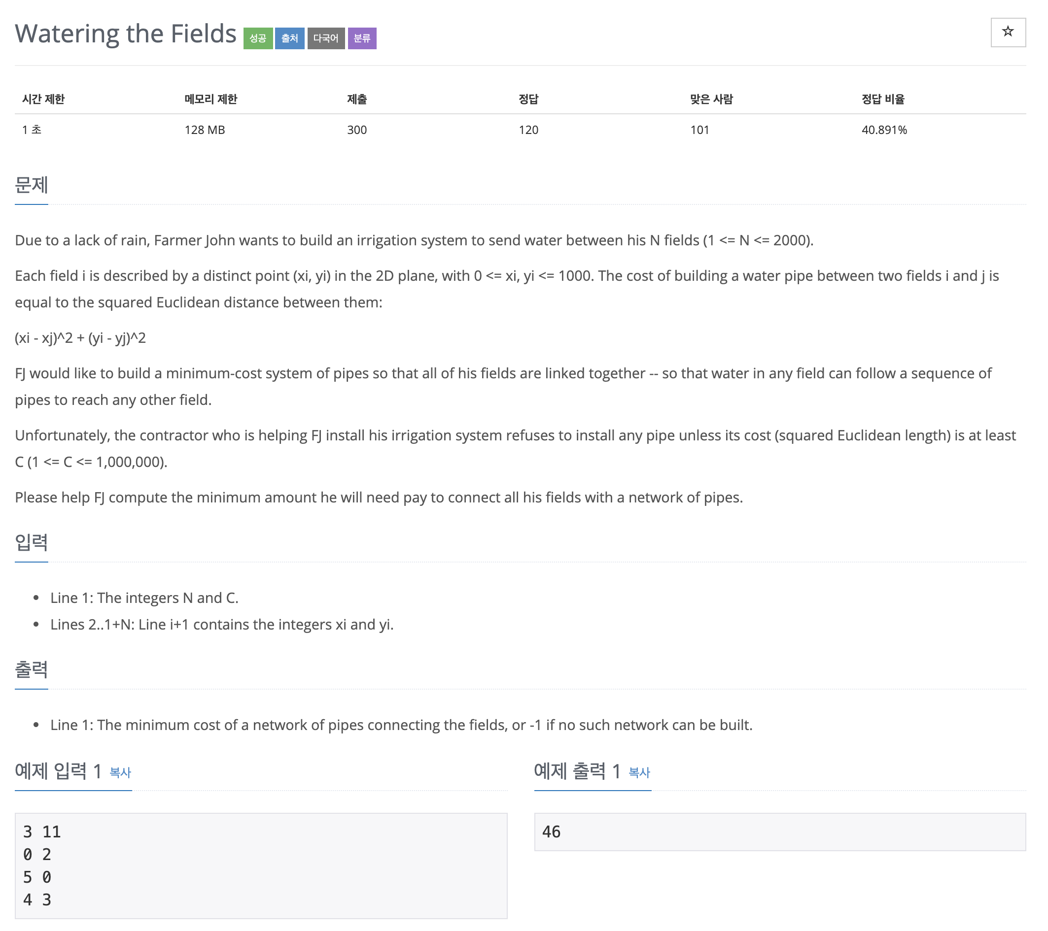 Input Details There are 3 fields, at locations (0,2), (5,0), and (4,3). The contractor will only install pipes of cost at least 11. Output Details FJ cannot build a pipe between the fields at (4,3) and (5,0), since its cost would be only 10. He therefore b
