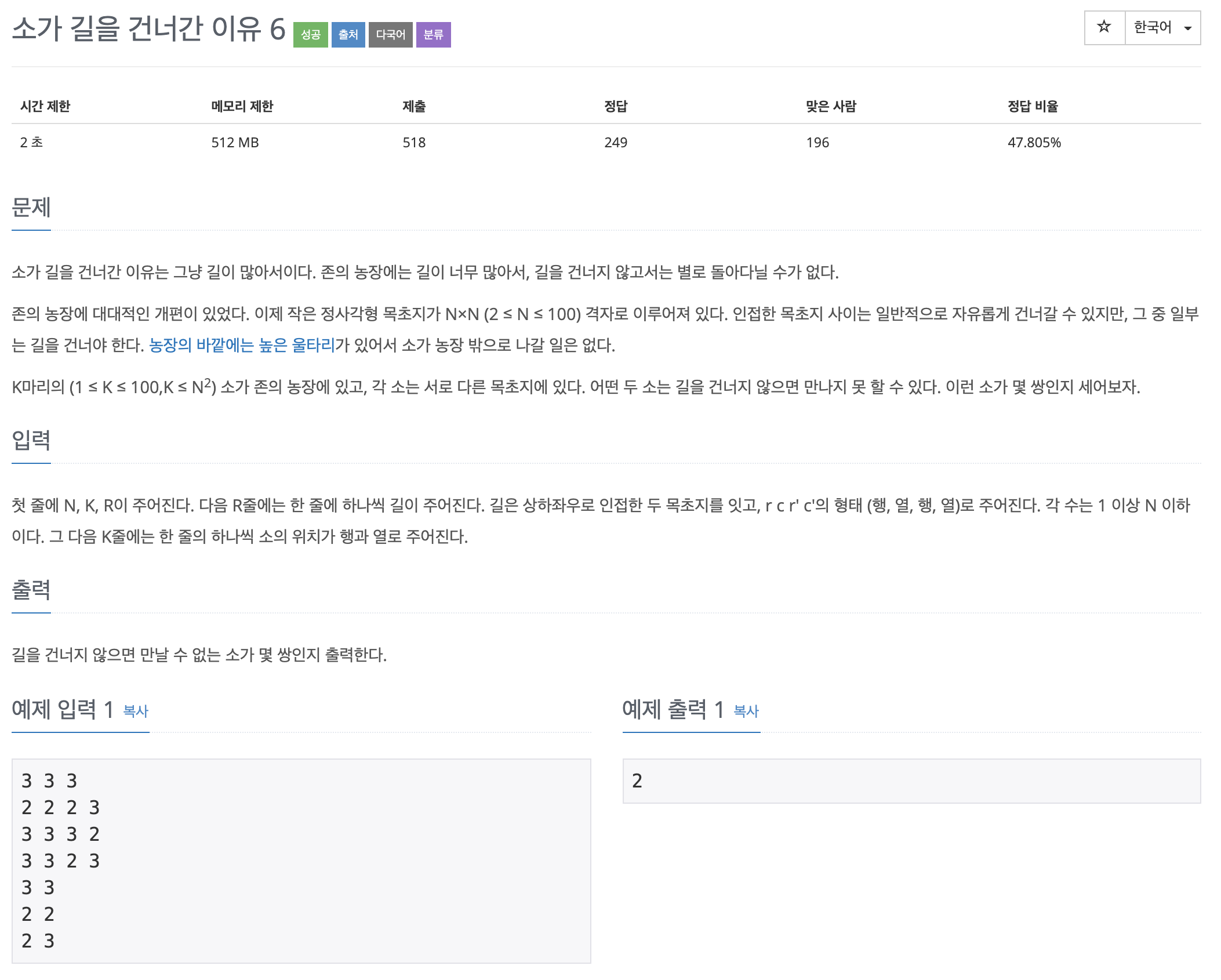 소의 위치를 시작점으로 하여 BFS를 통해 목초지를 탐색하되, 다리가 존재하는 경우는 탐색하지 않도록한다.