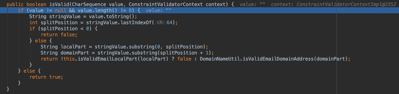 EmailValidator의 슈퍼클래스인 AbstractEmailValidator.java의 isValid() 메소드를 살펴보면 확인할 수 있습니다.