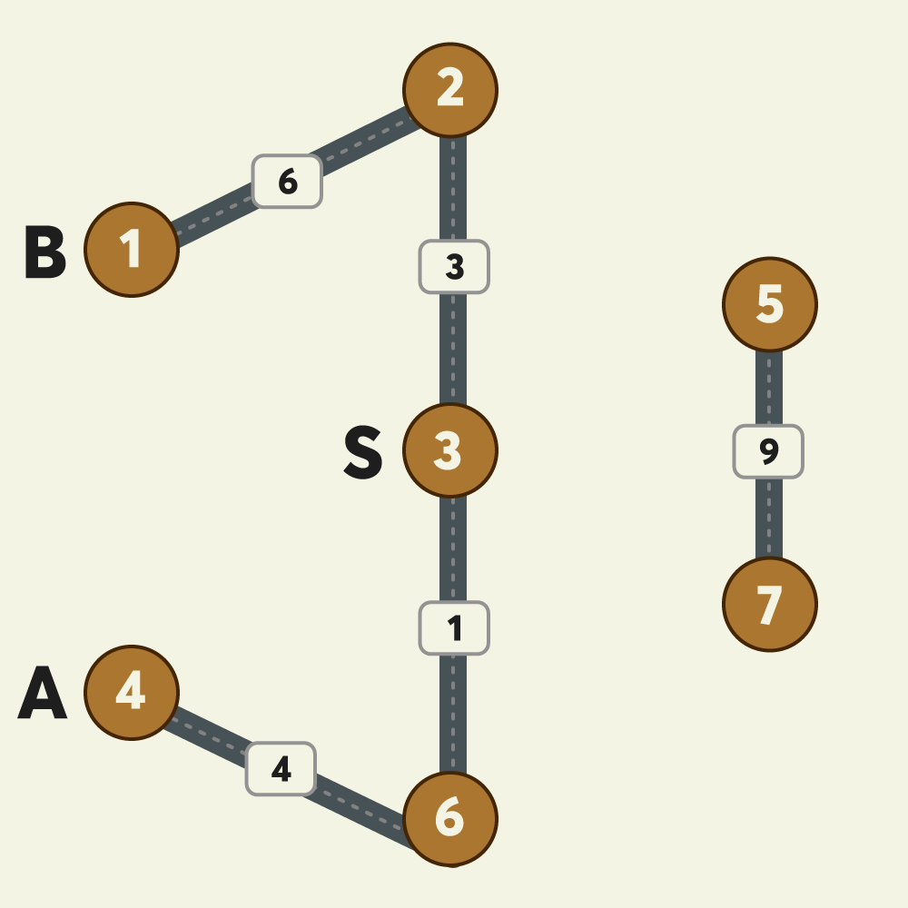 - 지점 s, a, b는 1 이상 n 이하인 자연수이며, 각기 서로 다른 값입니다.