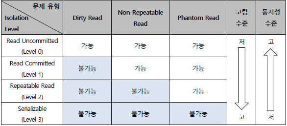 4단계로 구성되어 있으며, 수준이 높아질수록 트랜잭션간 고립 정도가 높아지는 대신 성능이 저하된다.