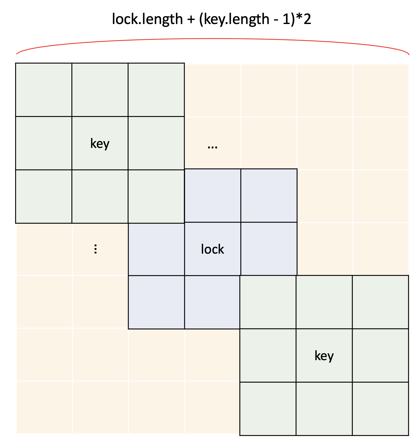 key의 오른쪽 하단 모서리가 lock에 걸치는 구간부터 왼쪽 상단 모서리가 걸치는 구간까지가 key의 범위가 된다.