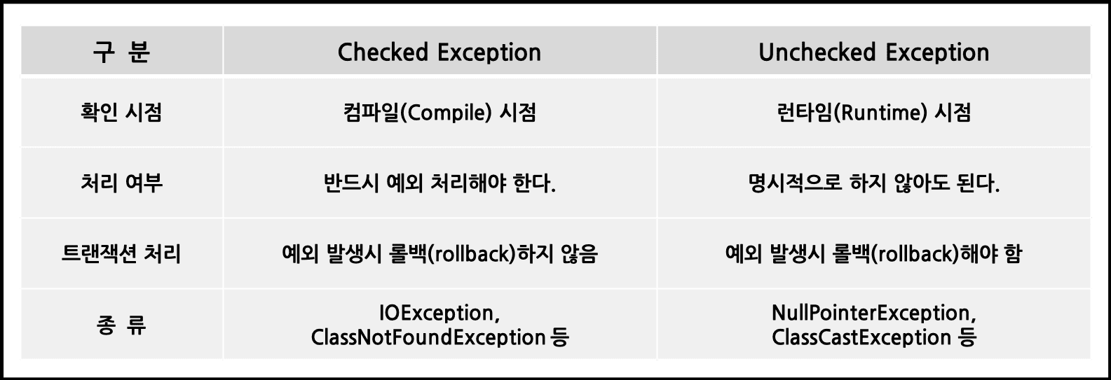 Checked Exception는 간단하게 RuntimeException을 상속하지 않는 클래스를 의미하고, Unchecekd Exception은 상속한 클래스를 의미한다. 자바에서는 RuntimeException과 이를 상속한 클래스는 명시적으로 예외 처리를 하지 않아도 된다.