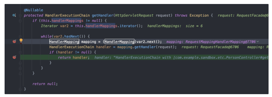 그렇다면 현재 @RequestMapping을 통한 매핑은 누가 처리하고 있는걸까? 확인을 위해 DispatcherServlet의 getHandler()에 다음과 같이 브레이크를 걸어두고 디버깅을 시도해봤다.