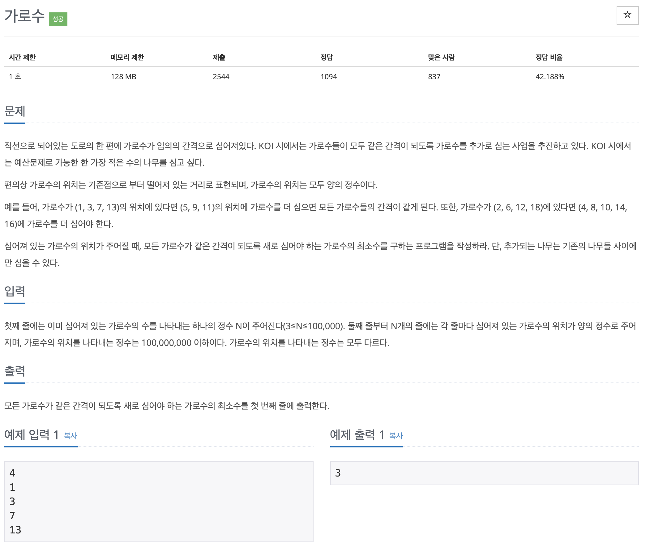 주어진 가로수의 간격 간의 최대공약수 == 최종 간격