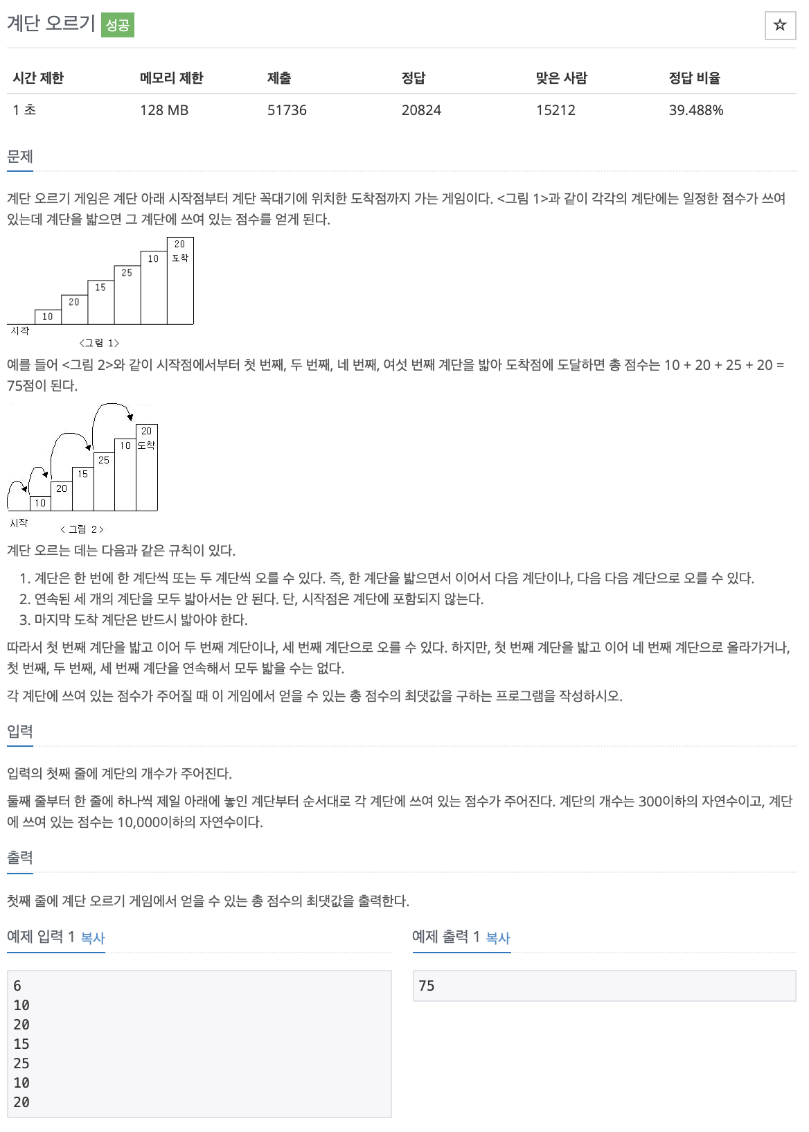 계단 오르기 게임은 계단 아래 시작점부터 계단 꼭대기에 위치한 도착점까지 가는 게임이다. <그림 1>과 같이 각각의 계단에는 일정한 점수가 쓰여 있는데 계단을 밟으면 그 계단에 쓰여 있는 점수를 얻게 된다. 예를 들어 <그림 2>와 같이 시작점에서부터 첫 번째, 두 번째, 네 번째, 여섯 번째 계단을 밟아 도착점에 도달하면 총 점수는 10 + 20 + 25 + 20 = 75점이 된다. 계단 오르는 데는 다음과 같은 규칙이 있다. 계단은 한 번에 한 계단씩