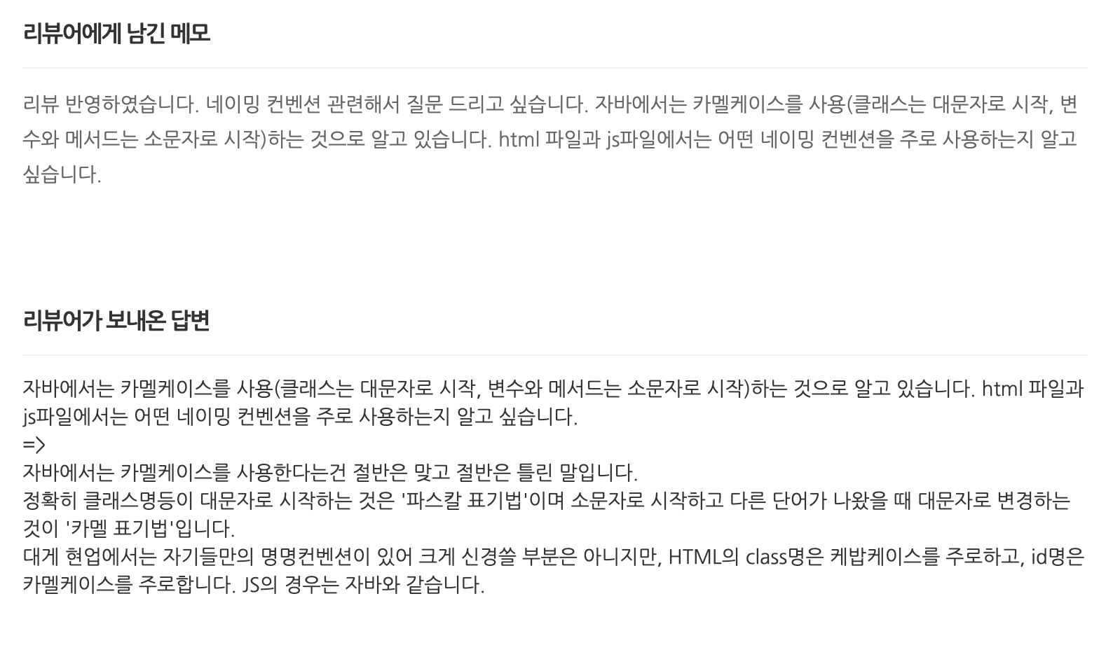 나 같은 경우, 백엔드에서 강의에서 학습한대로 UTF-8을 지원하도록 구현을 했는데 자꾸면 한글이 깨지는 현상이 나타나 한참 해메다가 코드가 의도대로 동작하지 않은 이유에 대해서 물어봤었다. 결론은 오타였다.. 다른게 문제가 아니라 나는 덜렁대는 게 문제 인 듯 하다. 프론트엔드에서는 네이밍컨벤션에 대해 질문을 했었다. 잘 못 알고 있던 것에 대해 짚어주셔서 바로 잡을 수 있었다.