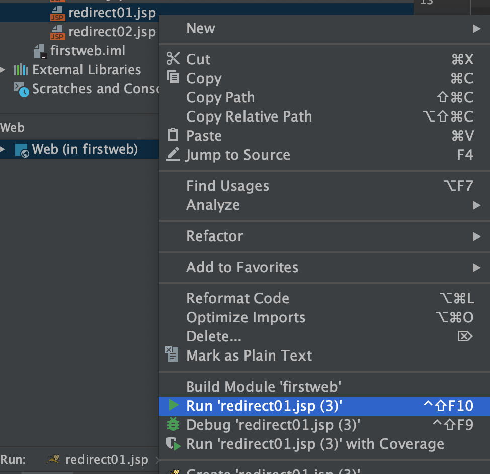 실행 방법 - redirect01.jsp를 우클릭해서 Run을 클릭 (intellij)