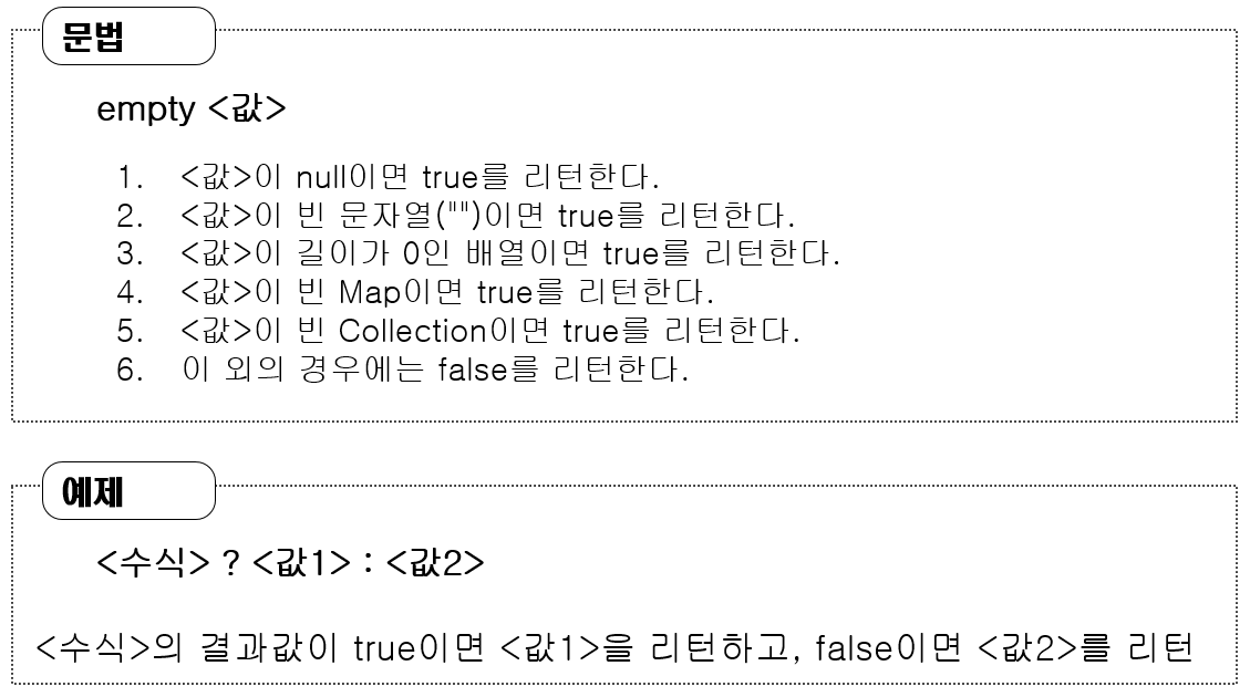 - 수치 연산자에서 사용되는 객체가 null이면 0으로 처리: ${null + 1} -> ${0 + 1}
