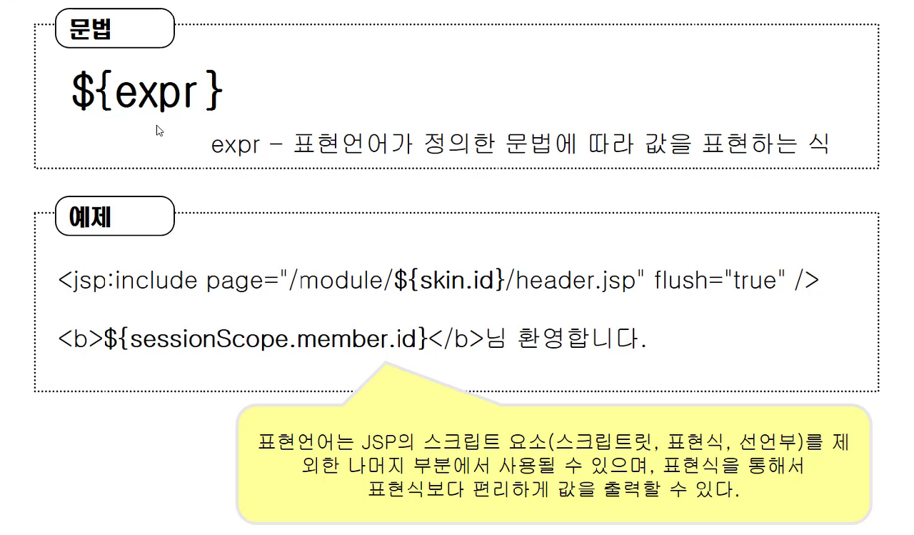 표현 언어(Expression Language)는 값을 표현하는 데 사용되는 스크립트 언어로서 JSP의 기본 문법을 보완하는 역할을 한다.