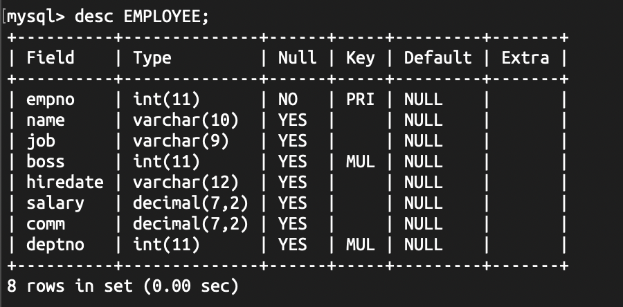 EMPLOYEE 테이블의 구조를 확인해 본 결과, 다음과 같았다.