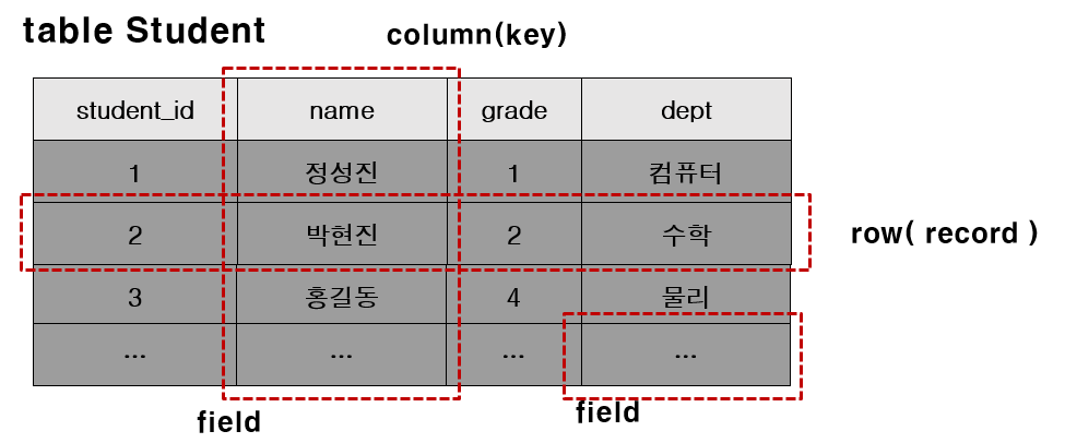 - Field: Row와 Column의 교차점으로 Field는 데이터를 포함할 수 있고 없을 때는 NULL 값을 가지고 있다.