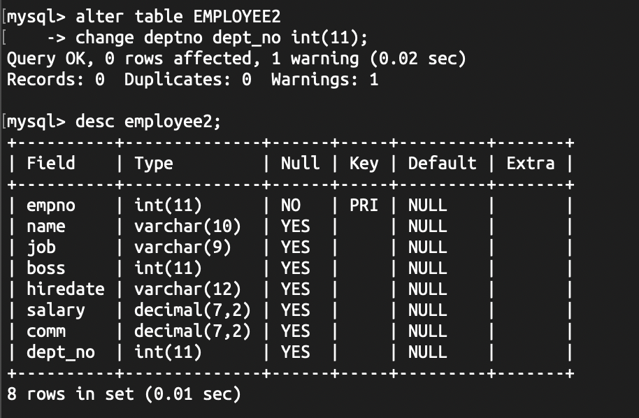 예제: EMPLOYEE2 테이블의 부서번호(deptno)를 dept_no로 수정하시오.