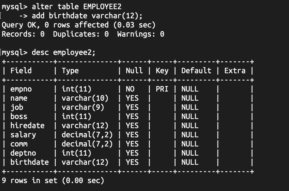 예제: EMPLOYEE2 테이블에 생일(birthdate) 칼럼을 varchar(12)형식으로 추가하시오.