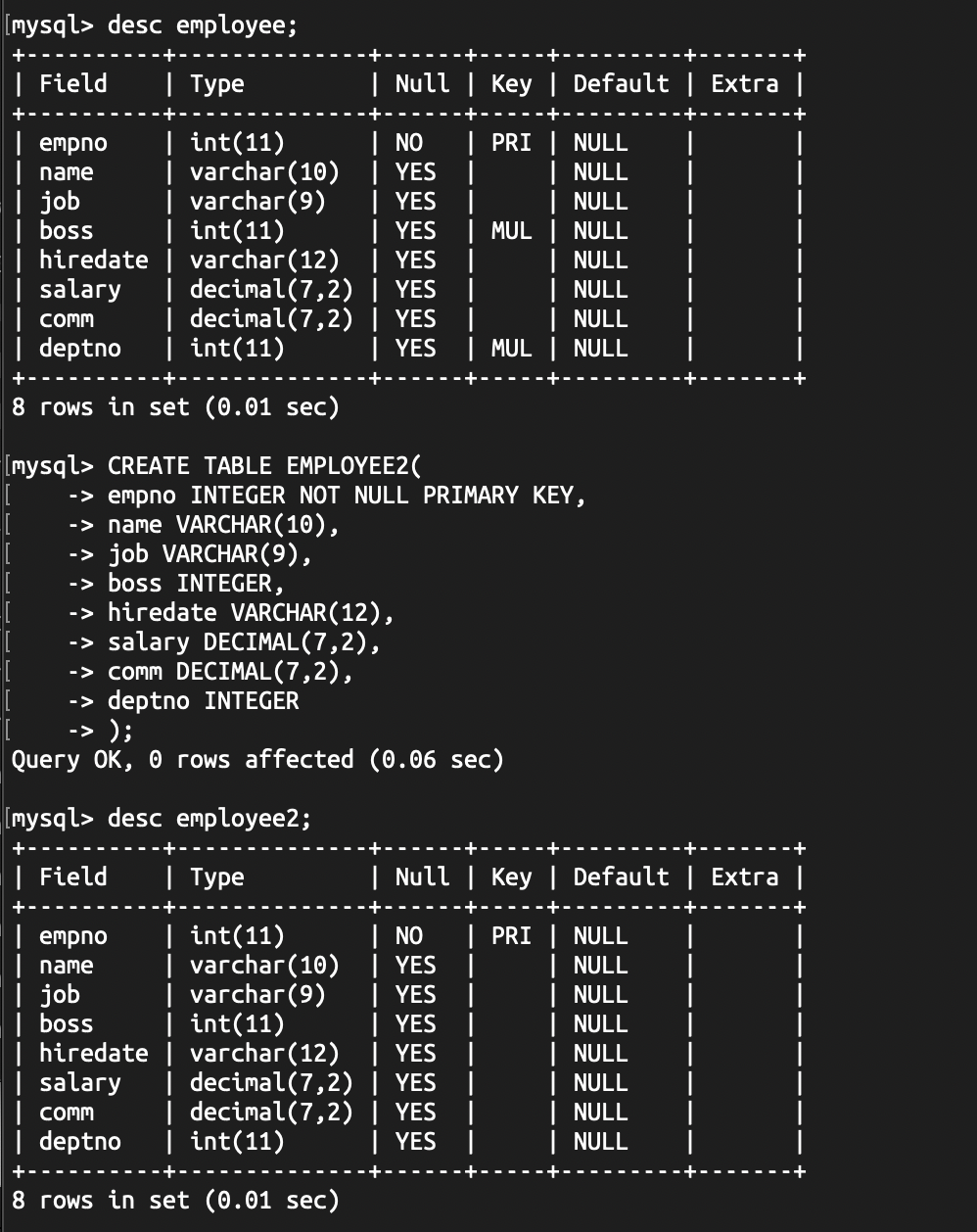 예제: EMPLOYEE와 같은 구조를 가진 EMPLOYEE2 테이블을 생성하시오.