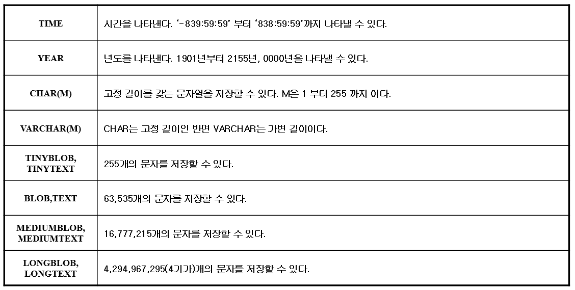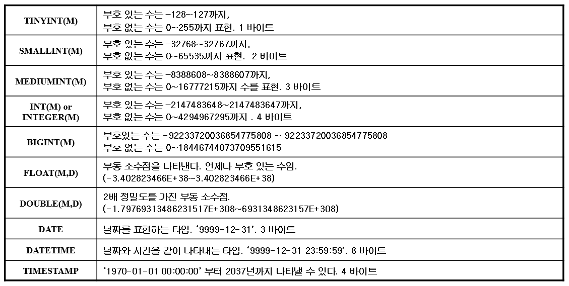 - 데이터 형 외에도 속성 값의 빈 값 허용 여부는 NULL 또는 NOT NULL로 설정