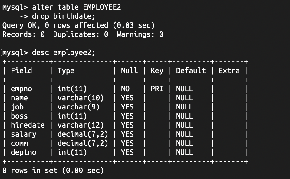 예제: EMPLOYEE2 테이블의 생일(birthdate) 칼럼을 삭제하시오.