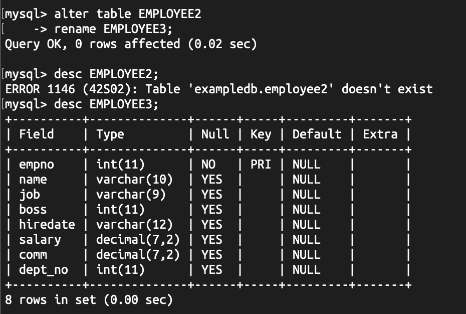 예제: EMPLOYEE2 테이블의 이름을EMPLOYEE3로 변경하시오.